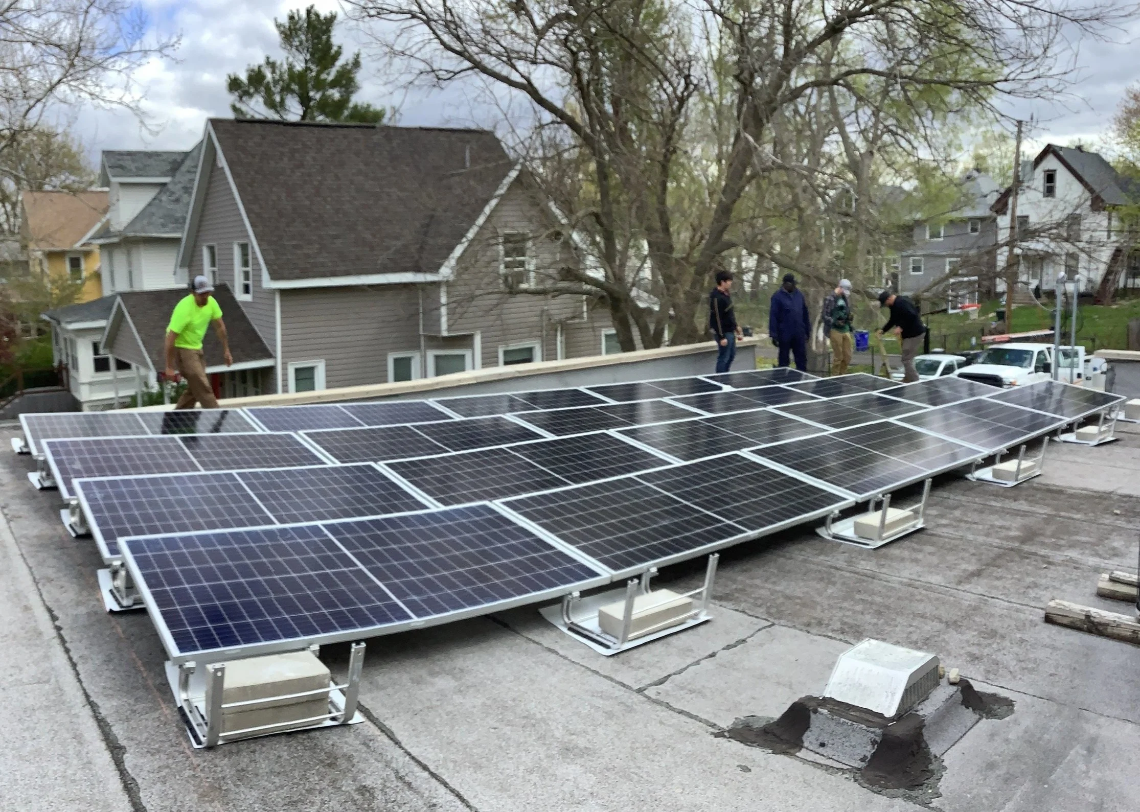 Solar panels by themselves cannot generate electricity during a power outage, but with the addition of battery storage, our system will have the capacity to generate charging stations, as well as a community refrigerator donated by Our Future.